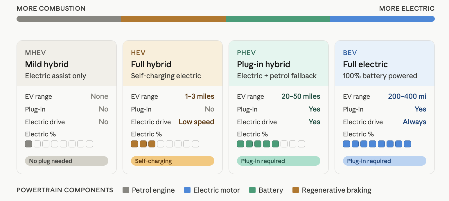 Mild Hybrid cars are at the very beginning of the spectrum. They rely on petrol or diesel, but they use a small electric motor that assists with acceleration and allows the engine to shut off sooner when braking or coasting. It improves fuel efficiency and slightly reduces fuel emissions.